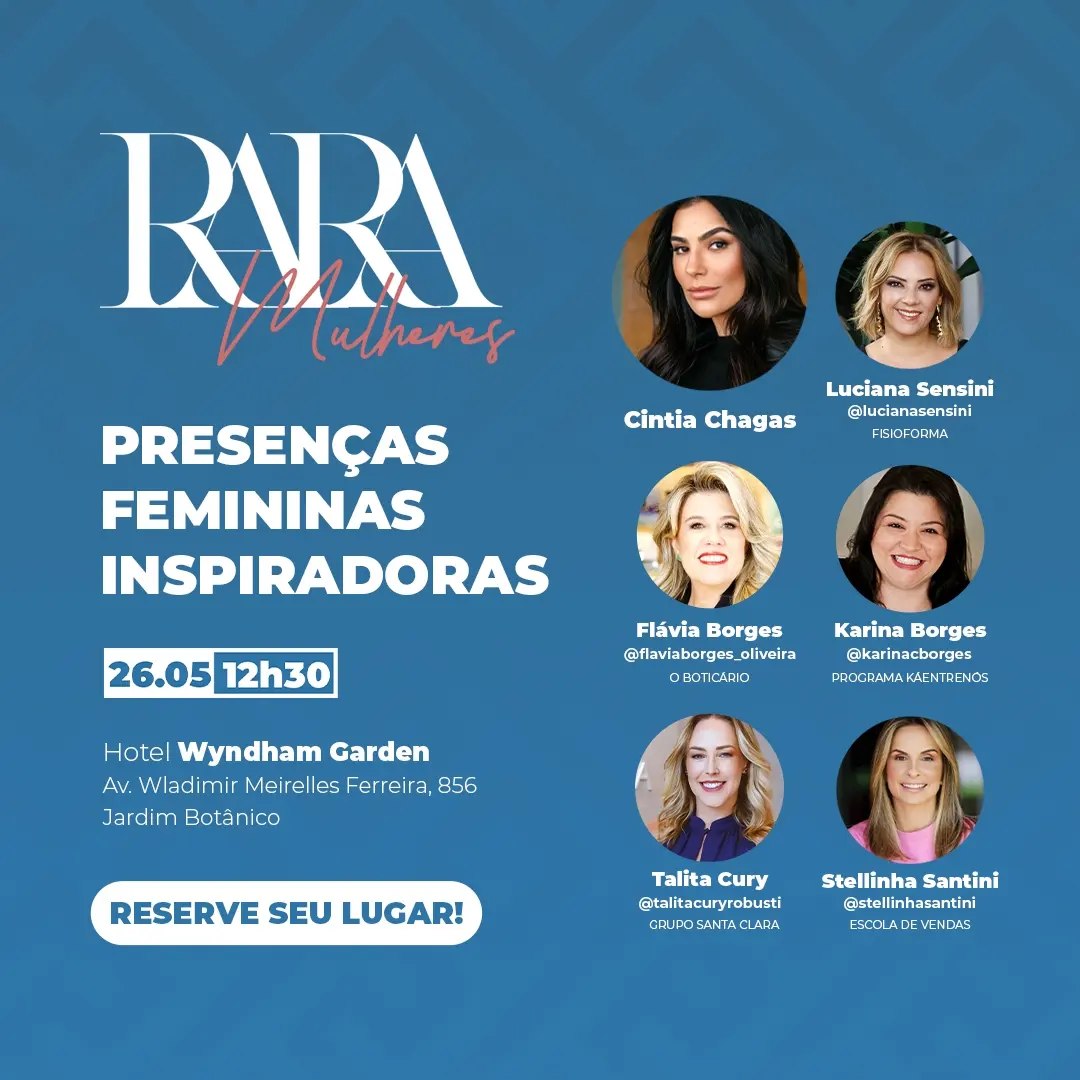 O evento faz parte da agenda de 2024 do RARA – Mulheres que inspiram como você!, movimento que conecta e aproxima mulheres empreendedoras e contará ainda com Talk Show com grandes nomes do empreendedorismo feminino de Ribeirão Preto como Flávia Borges, do O Boticário, Stelinha Santini, digital influencer, Luciana Sensini, da Fisioforma, Karina Borges, da ARMO do Brasil e Talita Cury, do Grupo Santa Clara.