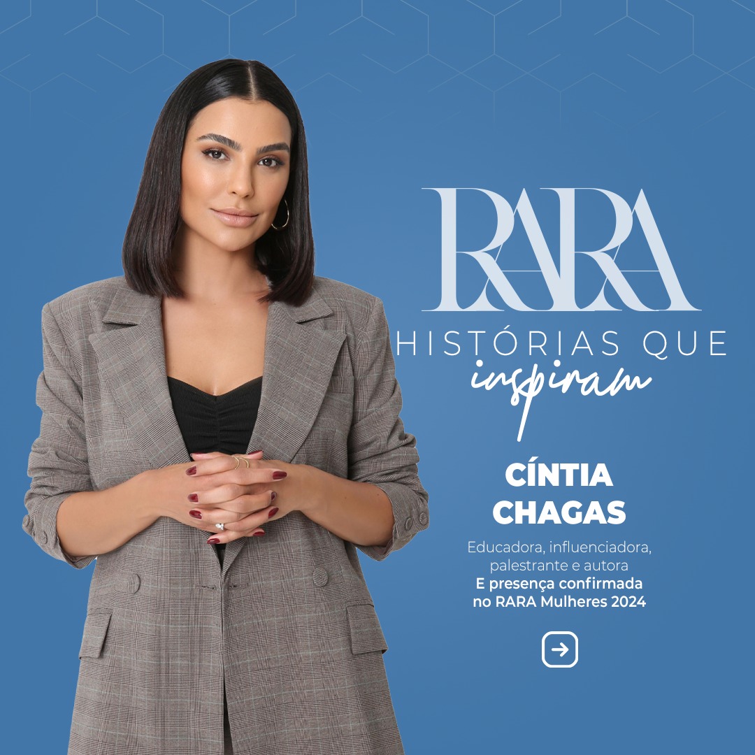 Cíntia Chagas estará presente no RARA MULHERES, evento que acontece no dia 26 de maio, em Ribeirão Preto/SP. Comunicadora nata, professora de português e de oratória, escritora de dois livros campeões de vendas, palestrante, entrevistadora e influenciadora com milhões de seguidores.