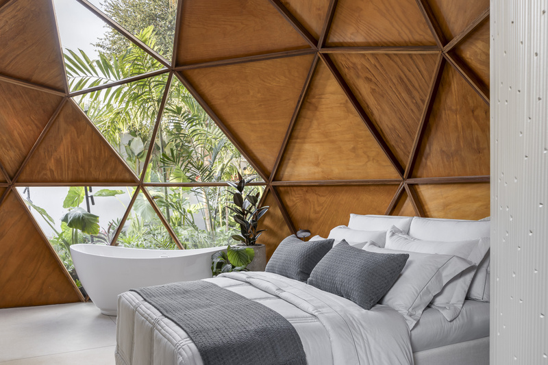 Já o Loft Máxima, da arquiteta Taiza Moiteiro, adotou as formas singulares do domo geodésico para criar um verdadeiro refúgio. O painel de vidro permite uma vista panorâmica, transmitindo a sensação de que o interior é uma extensão do ambiente natural ao redor. “As cores neutras e sóbrias acolhem, assim como a iluminação, transformando o local em um cenário perfeito para momentos de relaxamento e encontros memoráveis”, comenta Taiza.
