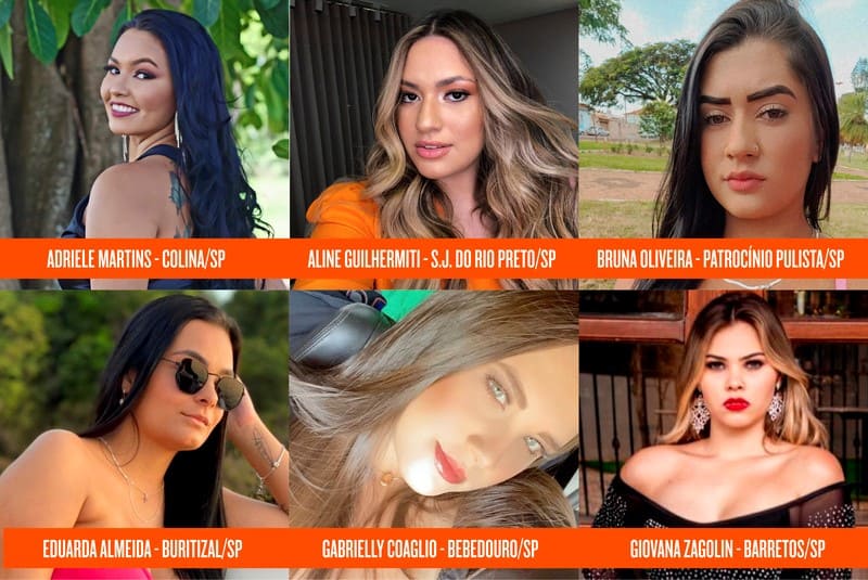 As candidatas são: Adriele Martins (Colina); Aline Guilhermiti (São José do Rio Preto); Bruna Oliveira (Patrocínio Paulista); Eduarda Almeida (Buritizal); Gabrielly Coaglio (Bebedouro); Giovana Zagolin (Barretos); Luana Cristina (Barretos); Luana Rafaela (Bebedouro); Luany Caitano (Sete Lagoas); Manuela Martins (Colina); Rafaela Cristina (Jaboticabal) e Tamires Roberta (Barretos).