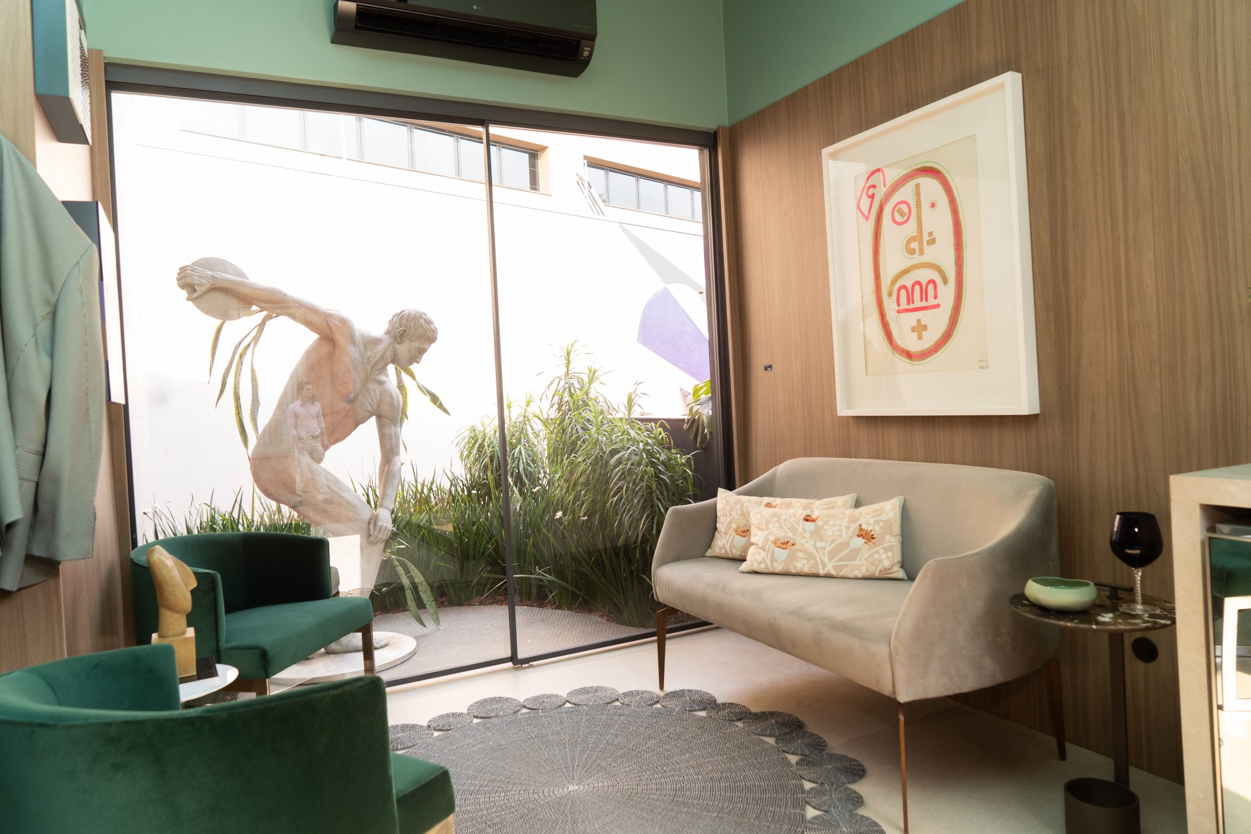 Obras e peças de artistas renomados despertam memórias afetivas e um olhar diferente nesses espaços do dia a dia. No Escritório Adega, de Sérgio Coelho e Daniel Sampaio, obras de arte da Galeria Marcelo Guarnieri trazem o equilíbrio entre o contemporâneo e a sensação de bem-estar.