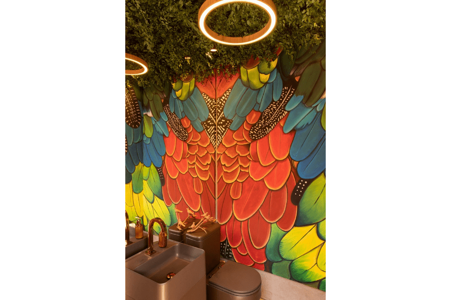 Já a arquiteta Vanessa Kimye colocou seu talento em prática no ambiente “Brasilidade”. O projeto de um banheiro público traz a riqueza do tema através do Cobogó Mundaú – elemento vazado utilizado na arquitetura -, trabalhos manuais artísticos e a riqueza das cores da fauna, trazendo sensações que variam de acordo com o gosto, o humor e a personalidade de quem passa pelo local. Tudo isso, ao som ambiente da floresta.