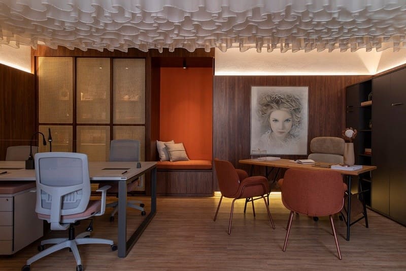 Assinando o “Anexo M”, a arquiteta Marcela Tiraboschi, de 25 anos, traz em seu projeto de home office um estilo mais sofisticado e elegante para um ambiente de trabalho, estimulando o bem-estar e a criatividade, além de proporcionar uma sensação de ‘lar’ ao lugar onde as pessoas tendem a passar a maior parte do dia.