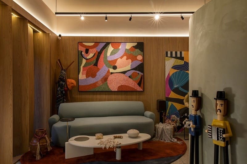 Já os arquitetos Mateus Passaglia e Nabila Feijó estão à frente do “Studio da Musicista”. Sempre atenta à história de seus clientes nos projetos, a jovem dupla combinou em seu ambiente elementos com perfeição ao criar um refúgio pensado para acolher uma mulher empreendedora, investidora, colecionista e, claro, musicista. Ultraeclético e contemporâneo, o studio apresenta tons românticos, pop-art e luz intimista.