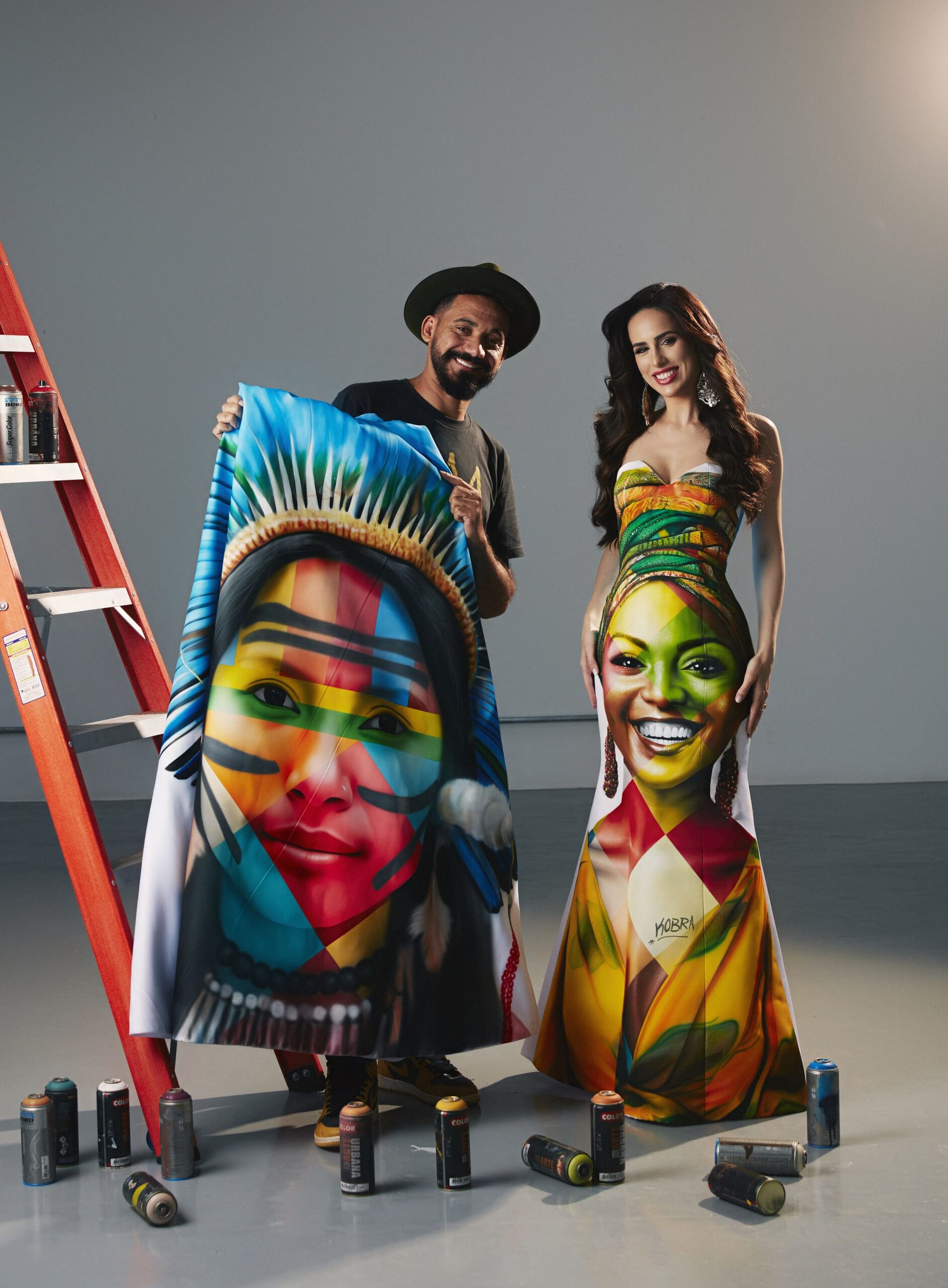 Em uma “tela branca” em formato de vestido, criado pelo estilista Bruno Oliveira, o muralista retrata a diversidade étnica com uma mulher preta e outra representante dos povos originários (frente e verso da peça). “A ideia surgiu da minha admiração pelo Kobra e pela conexão que temos por meio da sustentabilidade. Ele topou na hora, tamanha sua generosidade e entendimento sobre a importância feminina na sociedade. Contamos, no vestido, o que tenho perpetuado em meu reinado: a consciência de que estamos muito além da beleza física. Estou ansiosa para ver como o público vai reagir”, diz Mia sobre a parceria com o reconhecido artista.